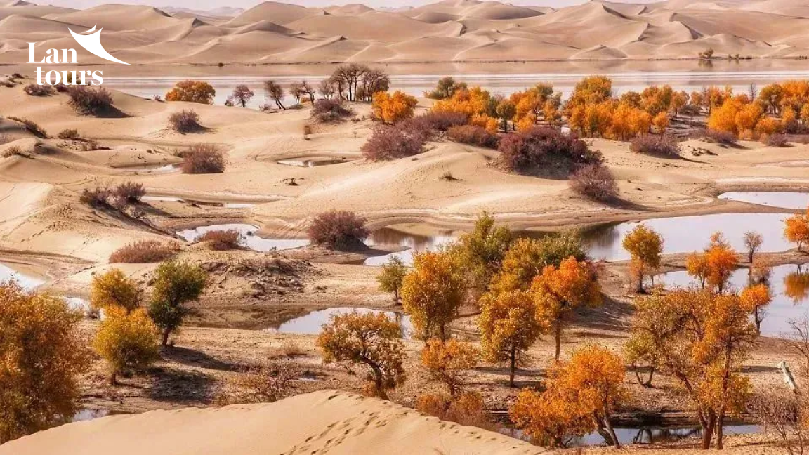 Sáng đoàn ghé thăm rừng hồ dương mùa thu với vẻ đẹp tuyệt sắc của những cây Dương ngả bóng xuống mặt hồ với tán lá như dát vàng trong nắng sớm. Nơi đây cùng là điểm check in hấp dẫn nhất khi đến Tân Cương mùa thu.