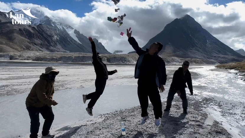 - Quý khách sẽ đi bộ 08-12 tiếng (18 km). Đây là một ngày đi bộ khá khó khăn vì quý vị sẽ phải vượt qua đèo Dolmala – Nơi cao nhất trong hành trình của vòng Kora (5,723m) vì vậy đoàn nên chuẩn bị khởi hành từ sáng sớm. Đèo Dolma La là một vùng đất được rải kín những đống đá mini nhỏ, dốc và được treo đầy cờ lungta nhiều màu sắc. Một nơi cách biệt với thế giới bên ngoài.