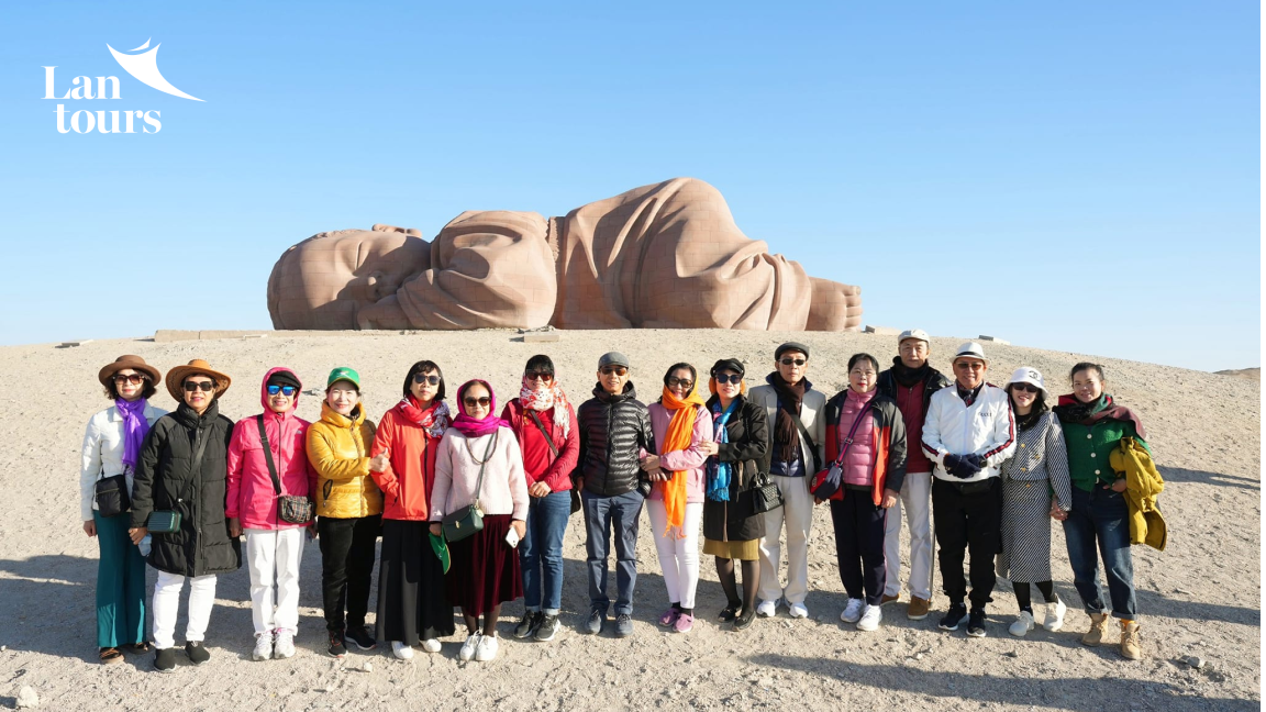 - Sau bữa sáng, đoàn thăm Đại địa chi tử - tượng em bé khổng lồ nằm giữa sa mạc Gobi, tác phẩm điêu khắc này được đặt tên là “Đứacon của Đất” nằm trên tuyến đường nối liền hai địa danh du lịch nổi tiếng của Trung Quốc,